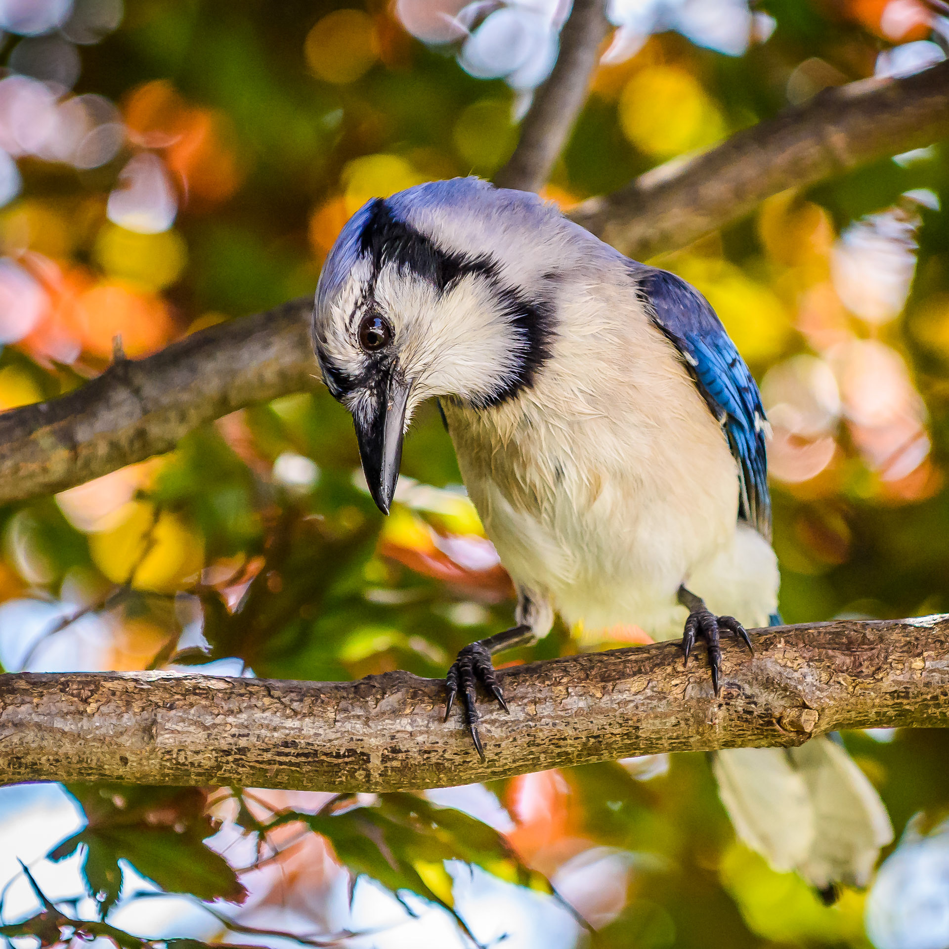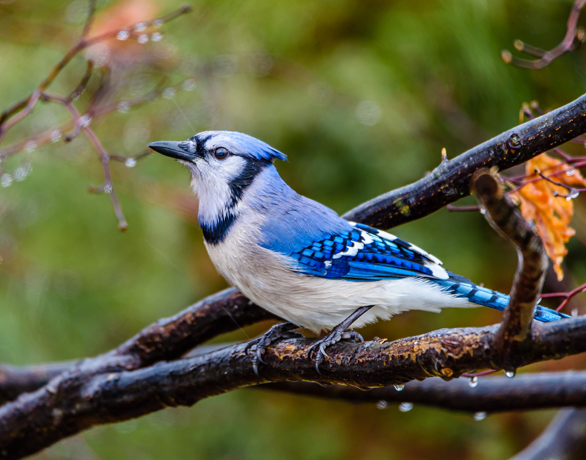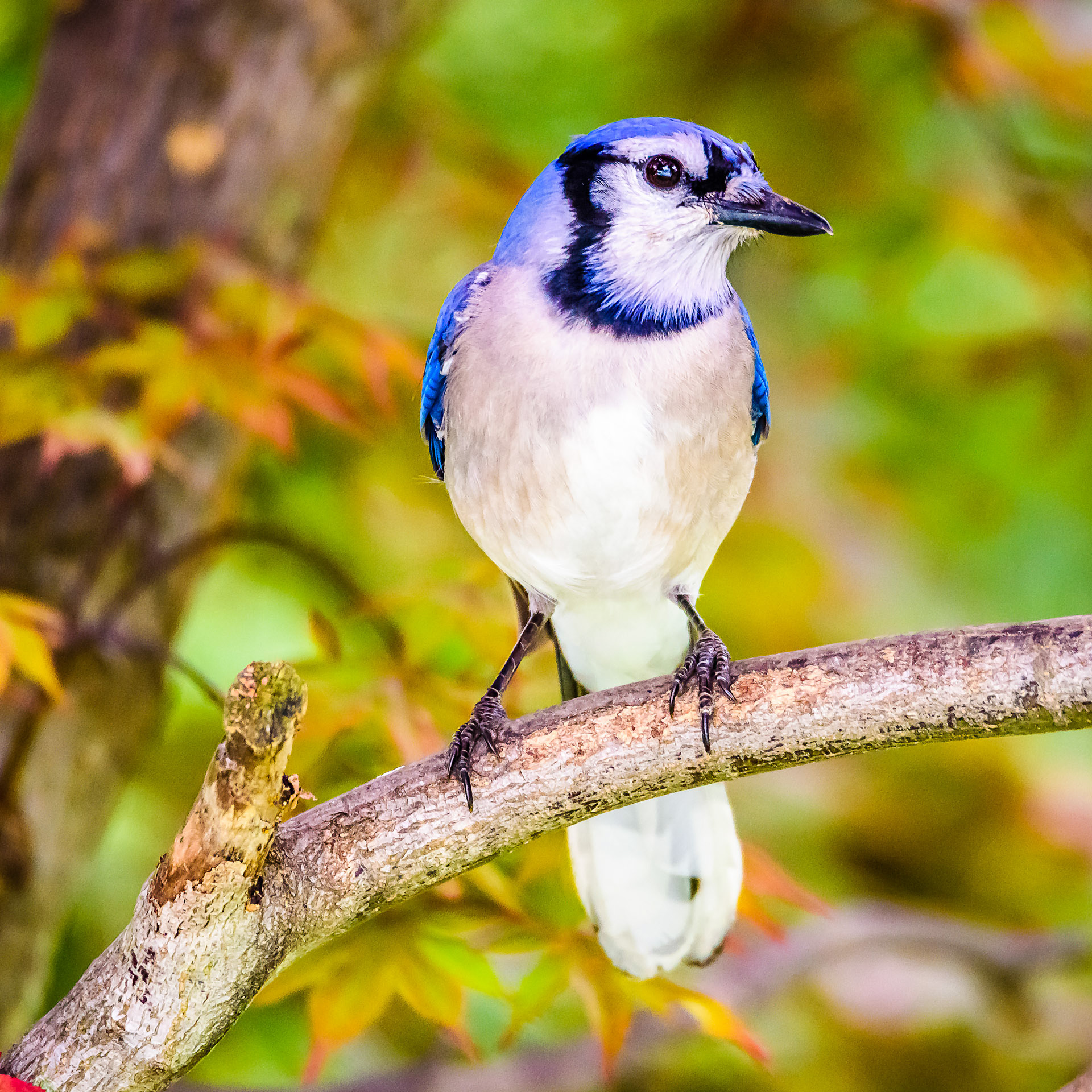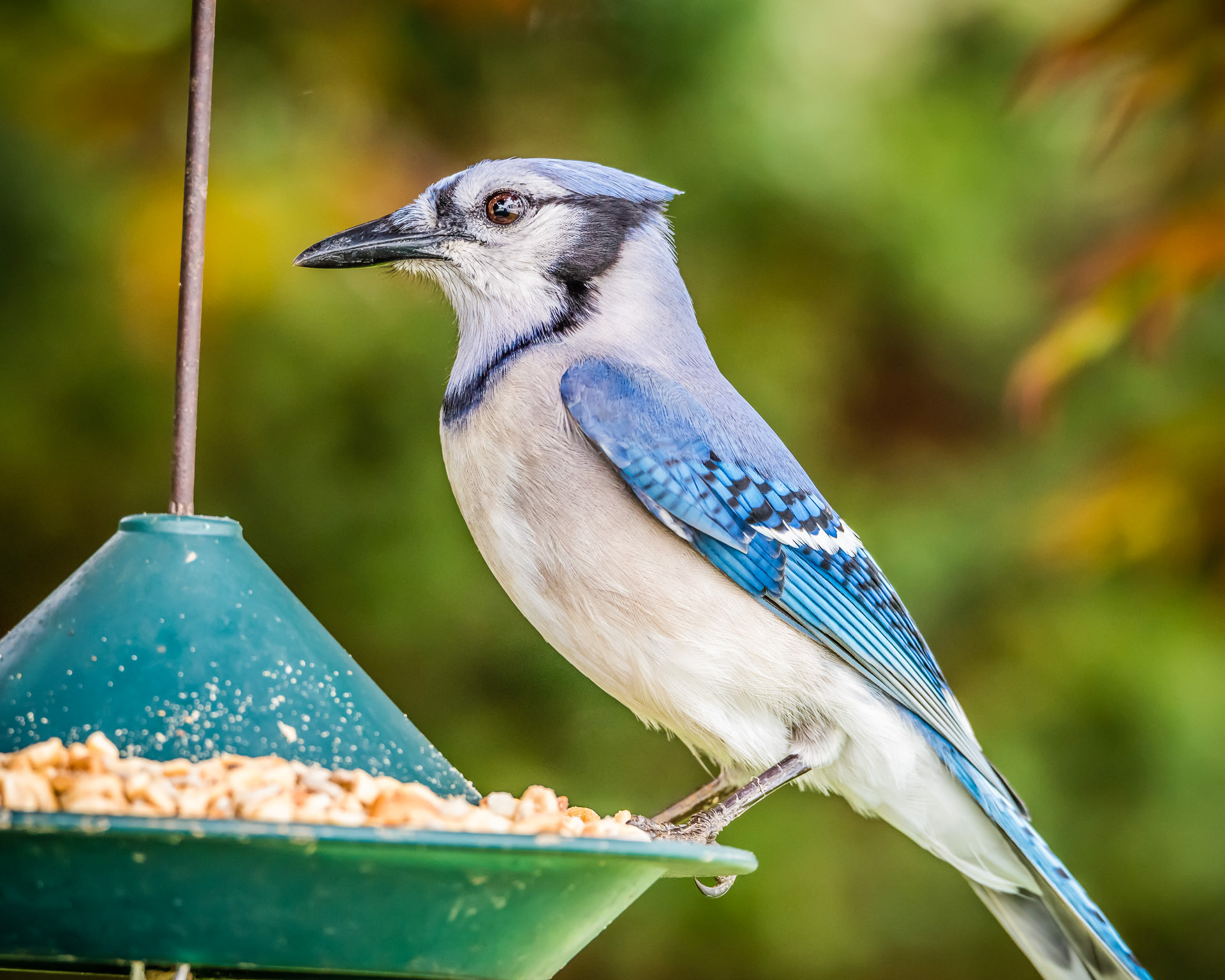 This common, large songbird is familiar to many people, with its perky crest; blue, white, and black plumage; and noisy calls. Blue Jays are known for their intelligence and complex social systems with tight family bonds. Their fondness for acorns is credited with helping spread oak trees after the last glacial period. The above description is provided from: www.allaboutbirds.org