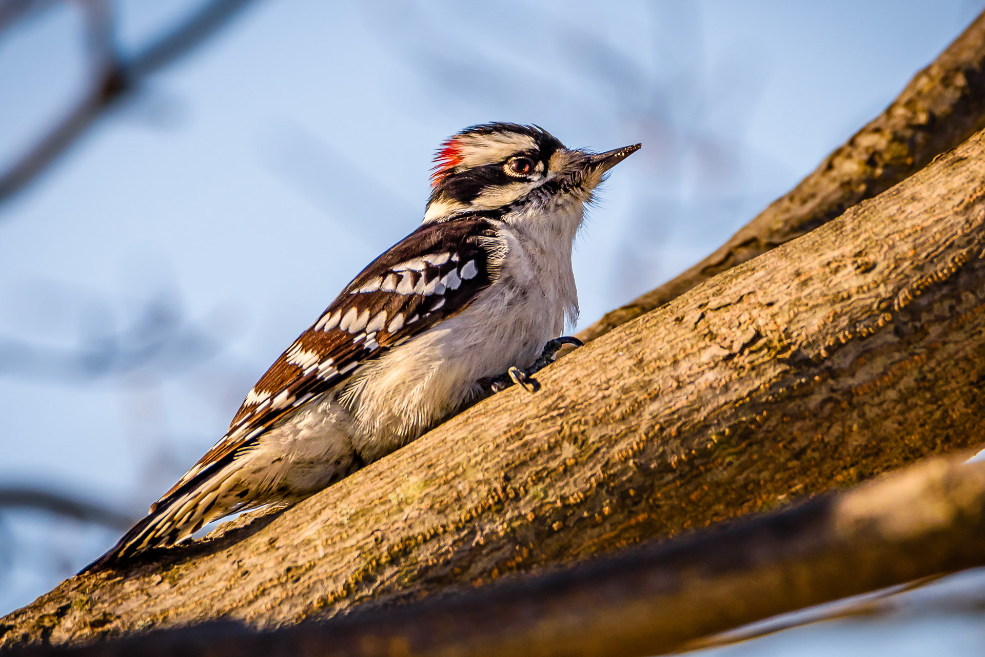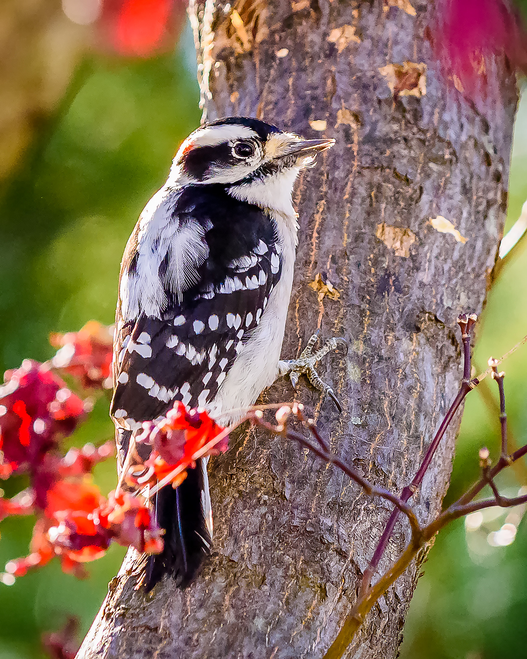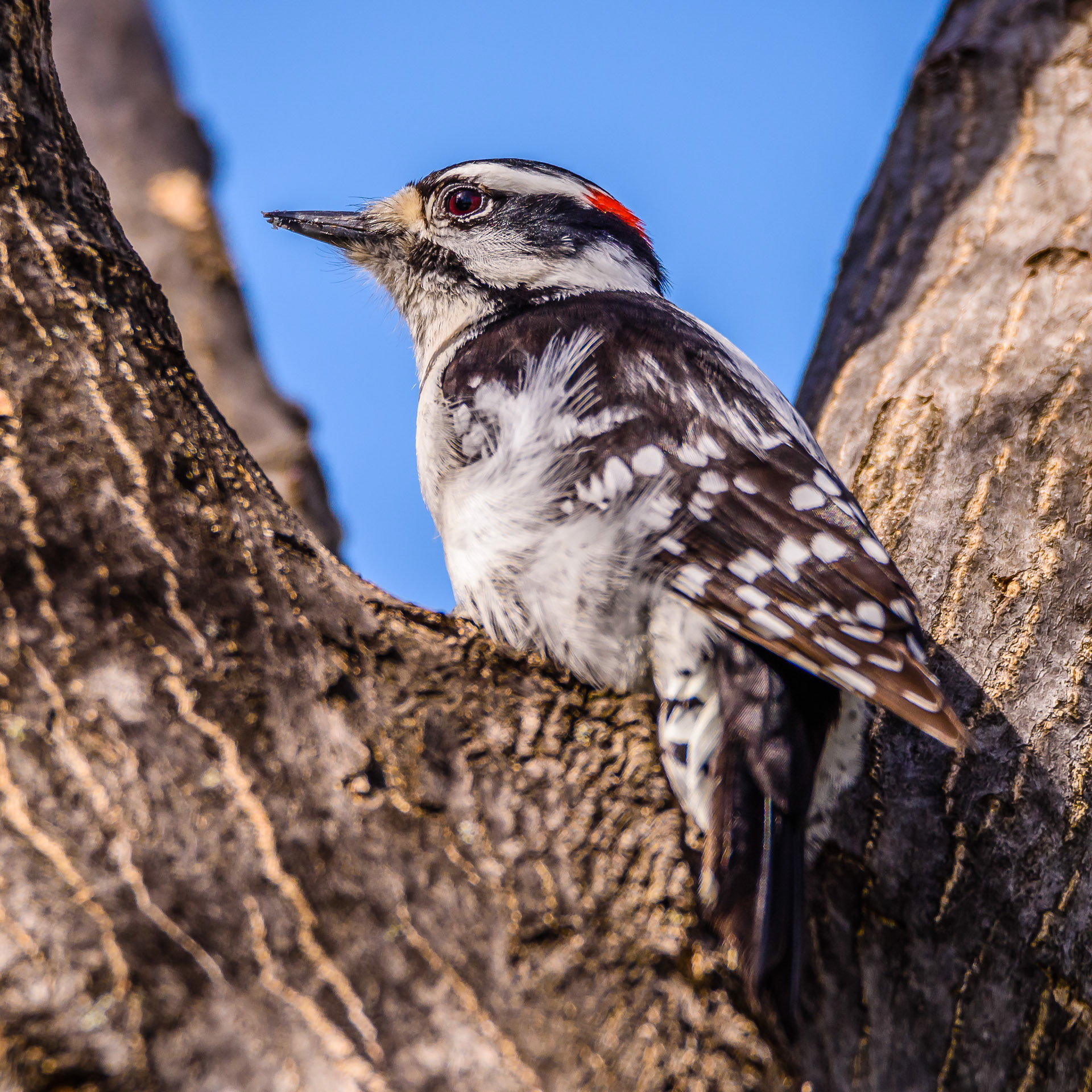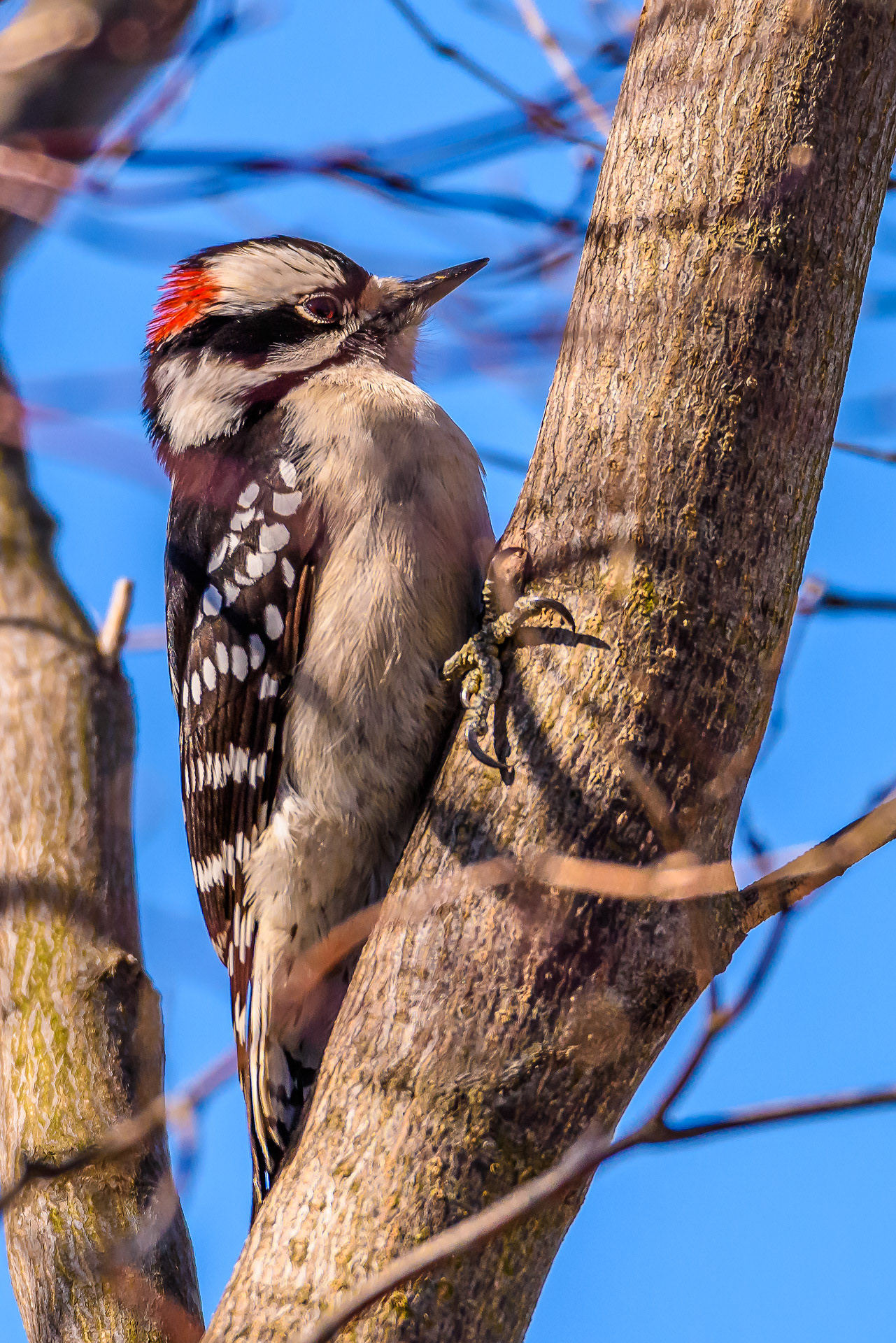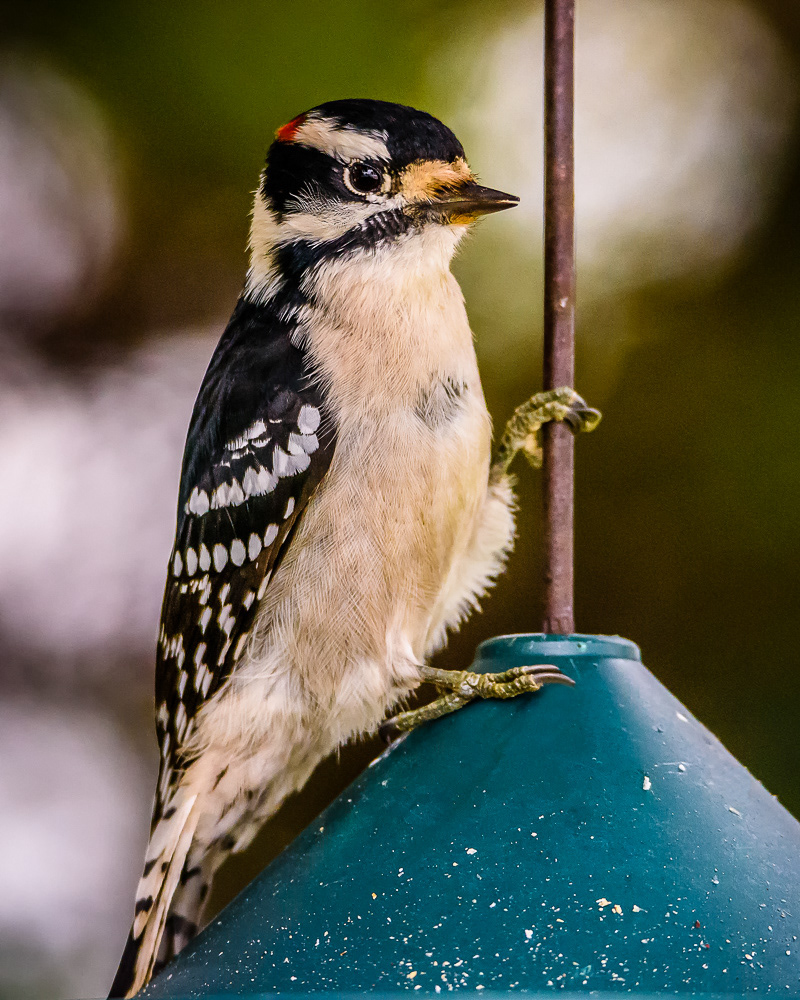 The active little Downy Woodpecker is a familiar sight at backyard feeders and in parks and woodlots, where it joins flocks of chickadees and nuthatches, barely outsizing them. An often acrobatic forager, this black-and-white woodpecker is at home on tiny branches or balancing on slender plant galls, sycamore seed balls, and suet feeders. Downies and their larger lookalike, the Hairy Woodpecker, are one of the first identification challenges that beginning bird watchers master. The above description is provided from: www.allaboutbirds.org