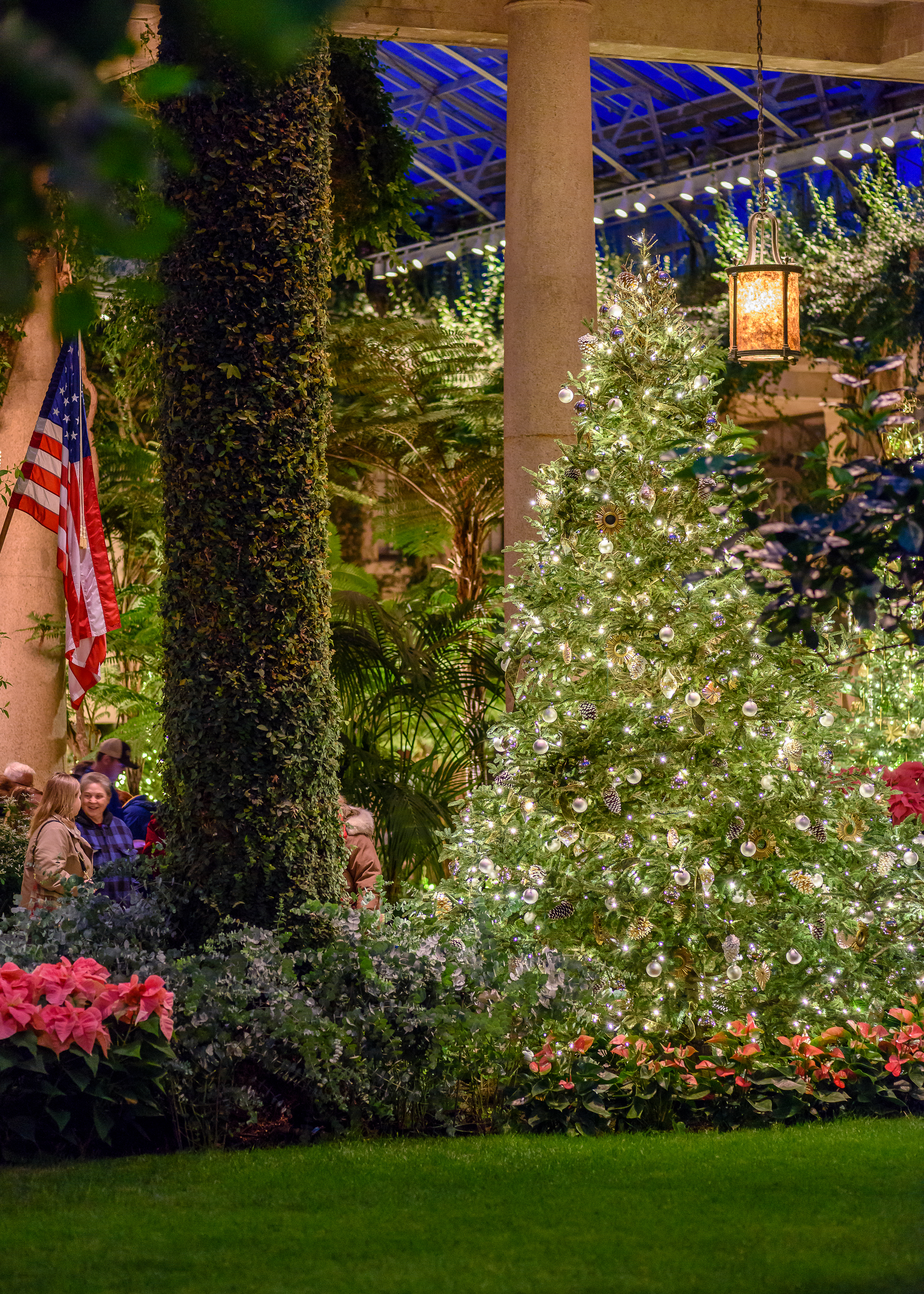 Experience the Joys of the Season Poinsettias, magnificent trees, and fragrant flowers transform our Conservatory into a holiday wonderland. Outside, colorful fountains dance to festive music, strolling carolers herald the season with song, and a half-million twinkling lights await. **The information above is from the Longwood Gardens website.**