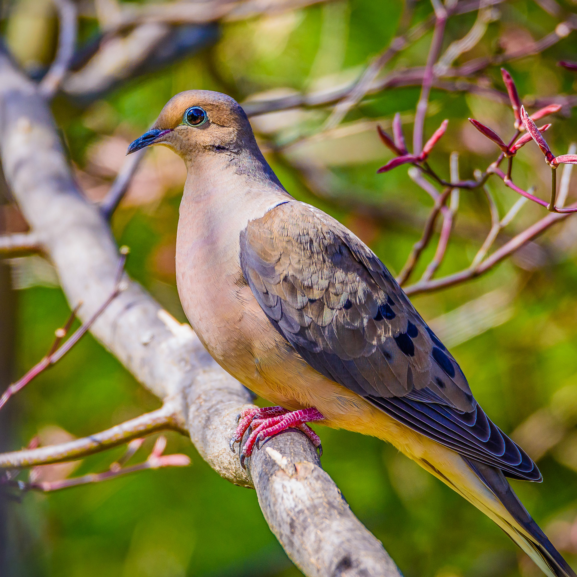 A graceful, slender-tailed, small-headed dove that’s common across the continent. Mourning Doves perch on telephone wires and forage for seeds on the ground; their flight is fast and bullet straight. Their soft, drawn-out calls sound like laments. When taking off, their wings make a sharp whistling or whinnying. Mourning Doves are the most frequently hunted species in North America. The above description is provided from: www.allaboutbirds.org
