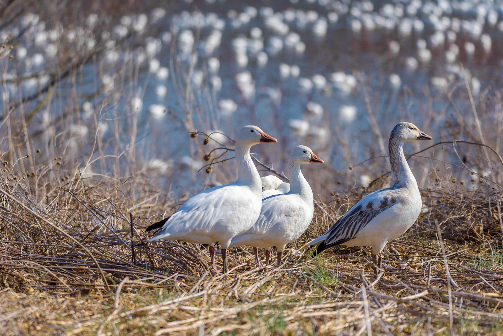 Watching huge flocks of Snow Geese swirl down from the sky, amid a cacophony of honking, is a little like standing inside a snow globe. These loud, white-and-black geese can cover the ground in a snowy blanket as they eat their way across fallow cornfields or wetlands. Among them, you might see a dark form with a white head—a color variant called the “Blue Goose.” Snow Geese have skyrocketed in numbers and are now among the most abundant waterfowl on the continent. The above description is provided from: www.allaboutbirds.org